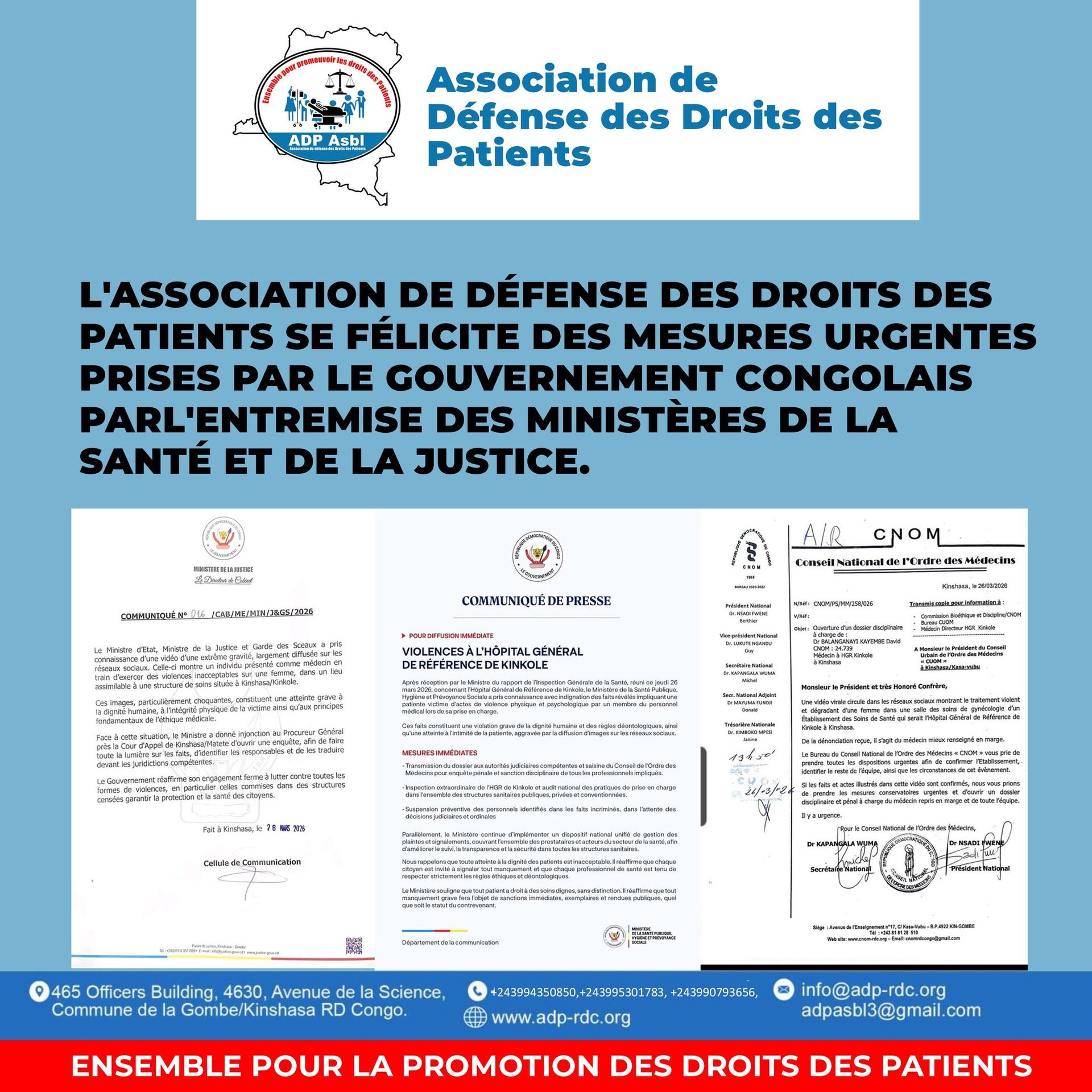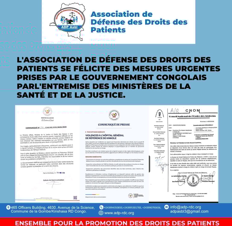 L'Association de défense des Droits des Patients se félicite des mesures urgentes prises par le gouvernement congolais par l'entremise des Ministères de la Santé et de la justice, faisant suite à ses alertes et dénonciations par rapport aux graves violations des droits humains commises à l'Hôpital Général de Référence de KINKOLE impliquant Docteur David BALANGANAYI KAYEMBE et ses alliés à l'encontre de leur patiente Madame MOYA DORCAS. Ces mesures qui doivent être suivies d'autres tel que recommandées par l'ADP devront constituer des véritables preuves du souci du gouvernement d'instaurer un système de santé axé sur le patient et basé sur la justice, la dignité humaine, la responsabilité et le total respect des droits fondamentaux du patient.